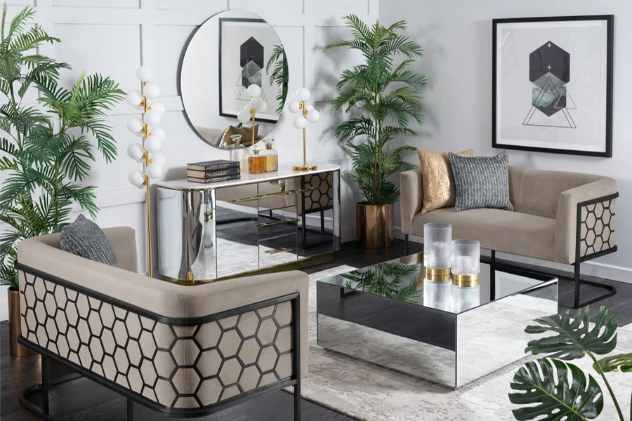- A unique and distinctive sofa with laser-cut hexagonal detailing