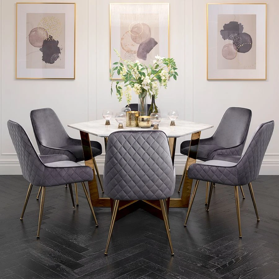 Kronos Brass Dining Table And Six Watson Storm Grey Chairs